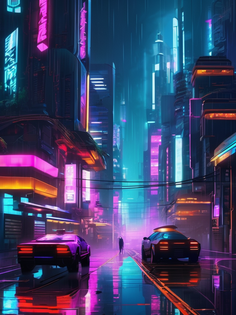 未来的な都市の雰囲気を演出し、ネオンの光や雨の反射をリアルに表現します。