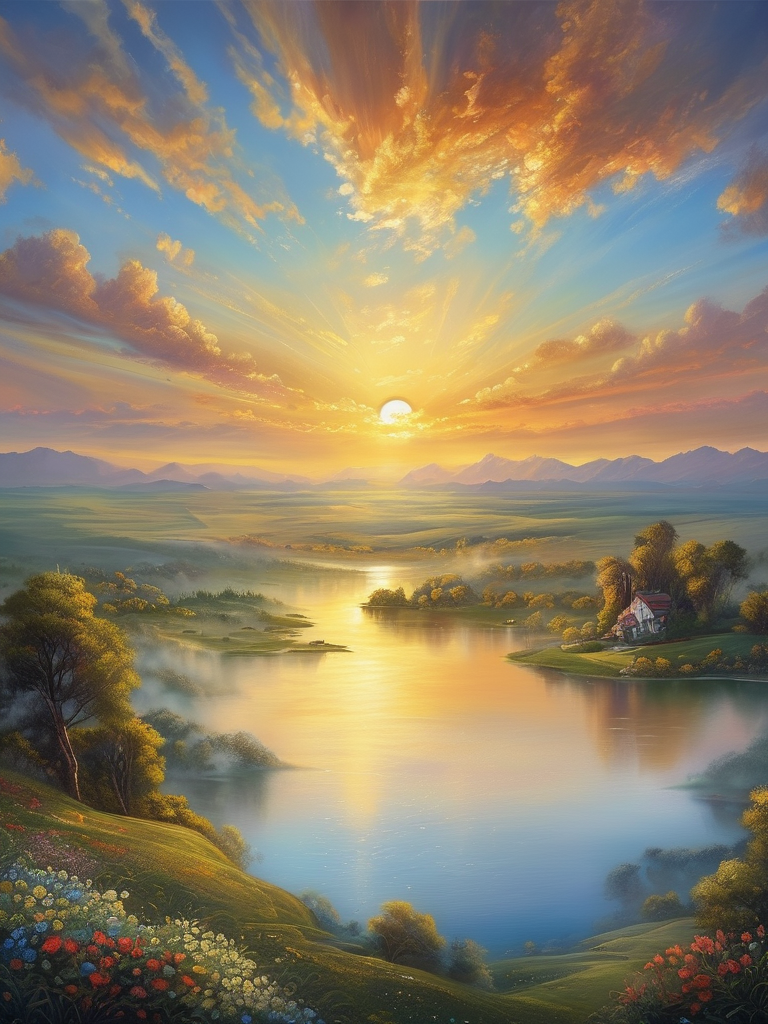 best quality, ultra-detailed, masterpiece, fantasy landscape, beautiful sunrise, soft clouds, magical atmosphere, dramatic lighting